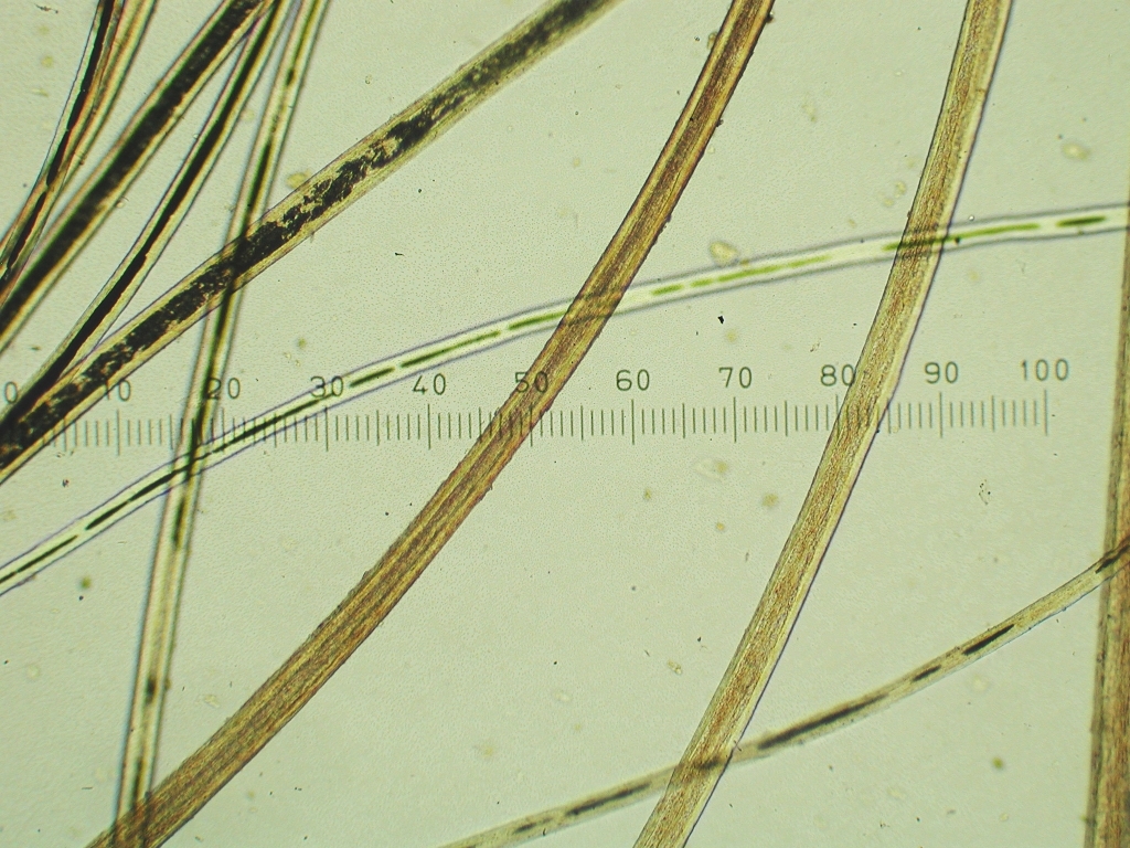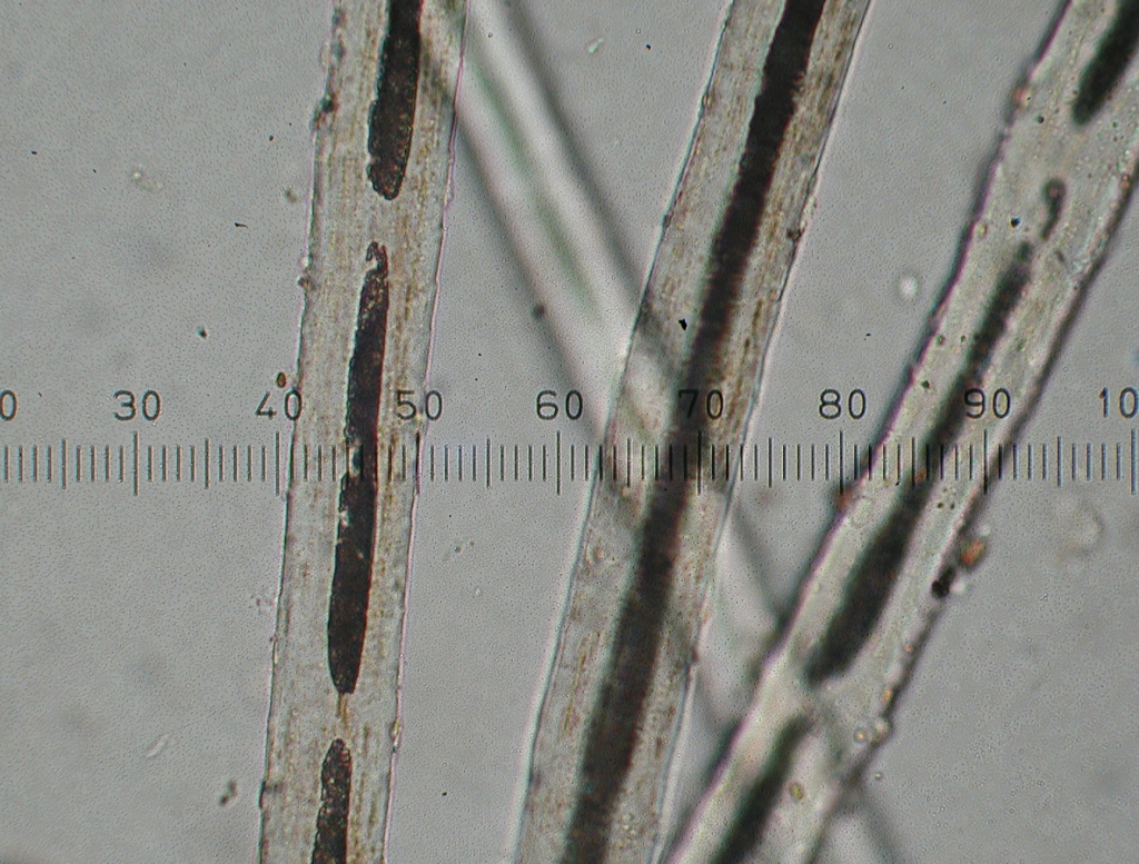 Alpaca fibers of various sizes with micrometer. Alpaca, 100x. Each division of the graduated scale is approximately 10 microns at the 100x magnification. Notice the variability in size of the fibers. These fibers were all taken from one lock of an alpaca fleece.