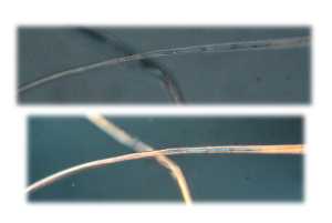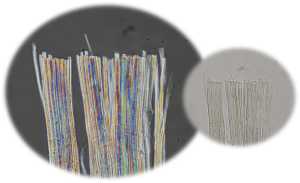 This composite image shows fibers using both conventional light microscopy (upper panel) and cross polarizing lenses (lower panel).