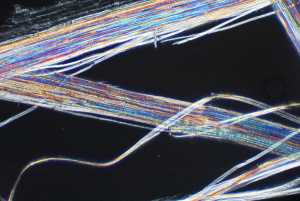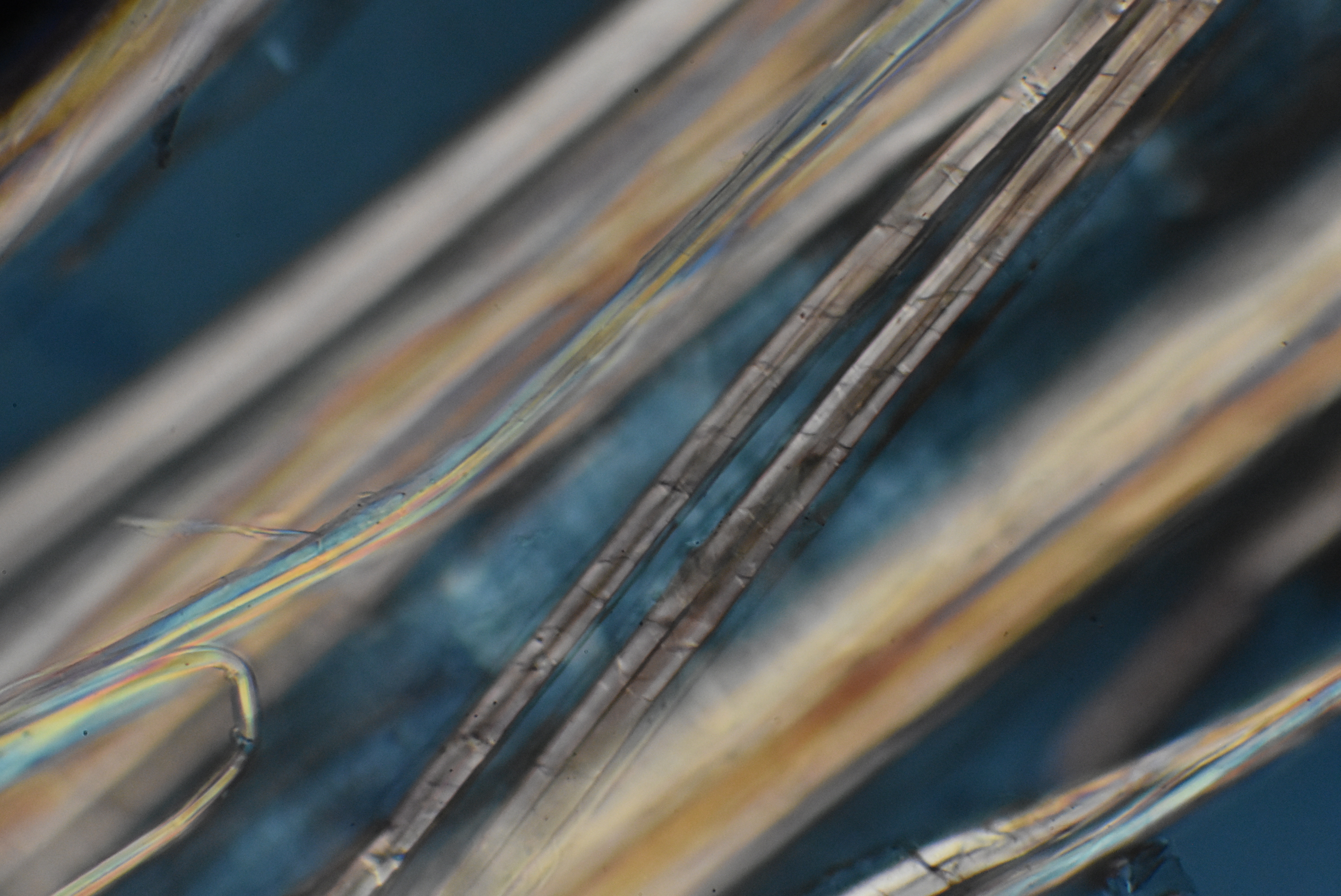 This is another polarization microscopic view showing several individual fibers exhibiting cross hatches. The outside of the fibers appears smooth.