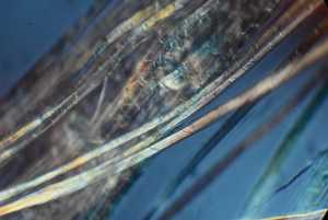Notice the individual fiber on the right...it has a flattened appearance as it courses up and to the right; again suggesting a relatively flat fiber. Also notice the short cross hatches in the blue colored fibers on the left. Those may represent some surface kinking or other irregularities. The sharply circumscribed black object on the left is an air bubble.