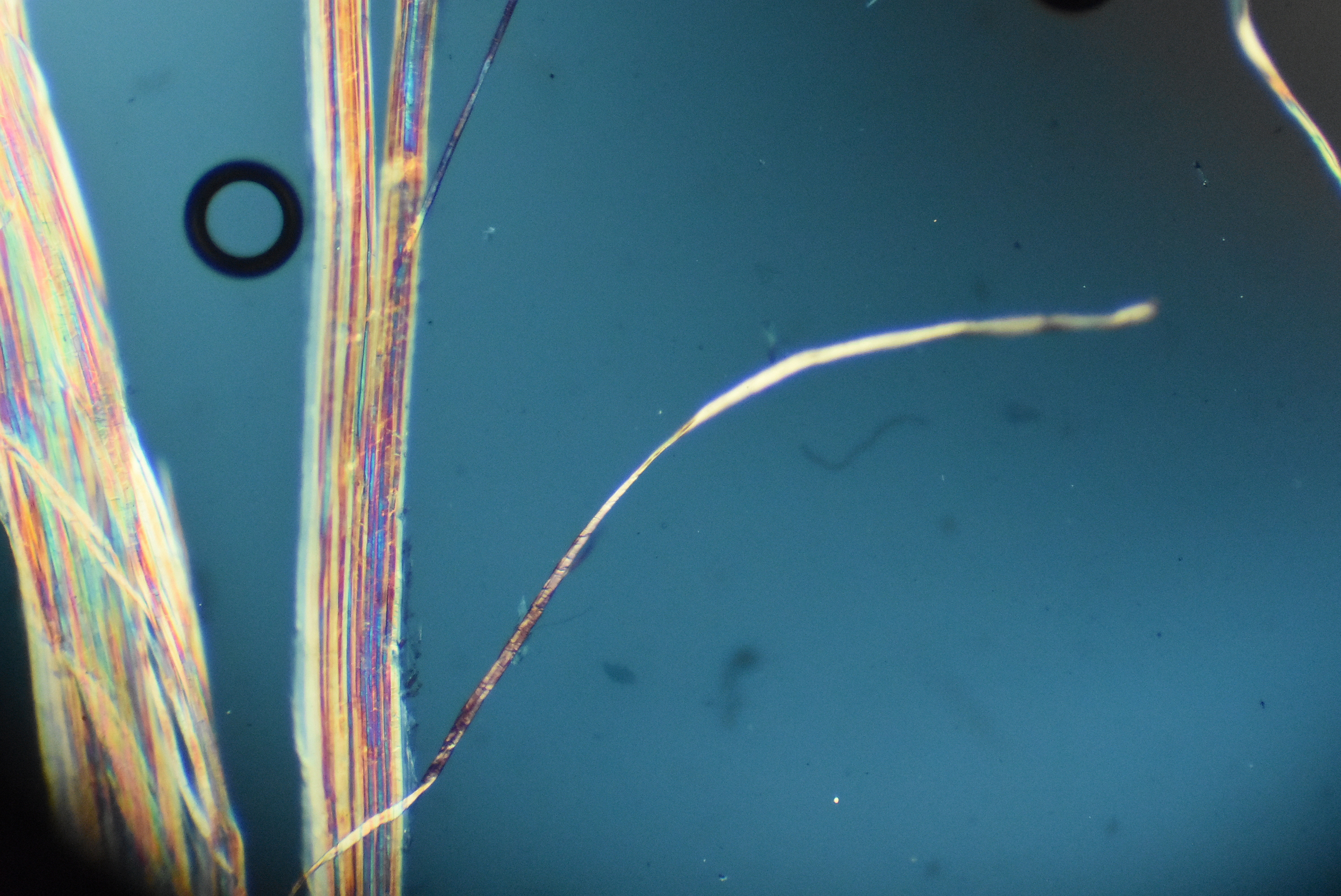 Another polarization microscopic view showing a single fiber in the foreground twisting slightly as it courses up and to the right. Again, the fiber appears somewhat flat. There is small air bubble at the upper left.