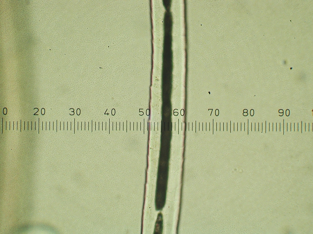 One alpaca fiber with micrometer. Alpaca, 400x. Here one can see how to measure one fiber, but since the fibers of the whole fleece are so variable a lot more measurements would need to be taken to characterize the range and distribution of fiber sizes in the fleece. At 400x, each division of the scale is 2.5 microns approximately.