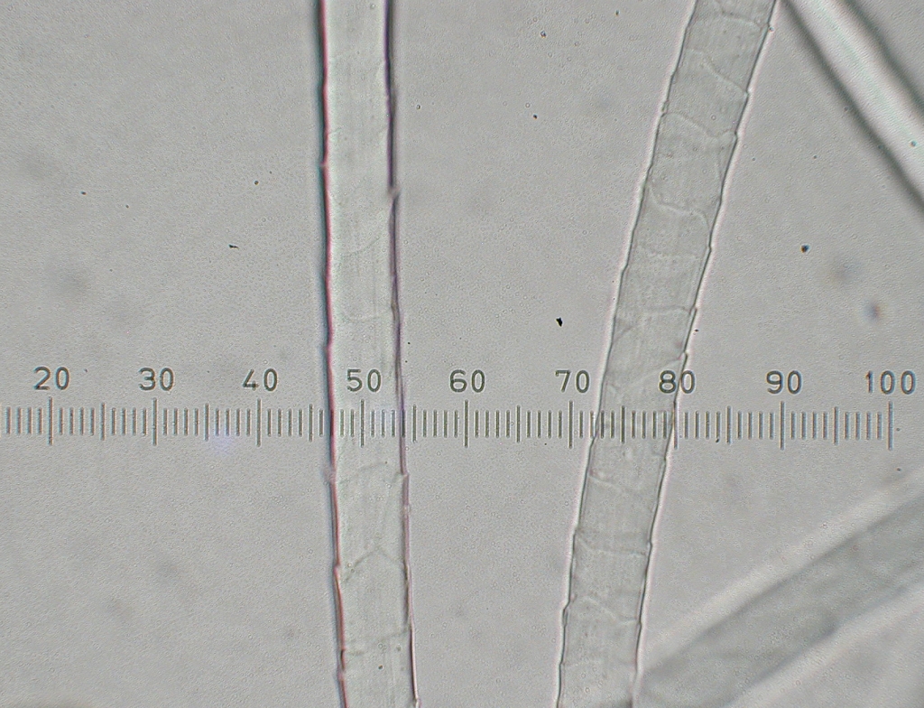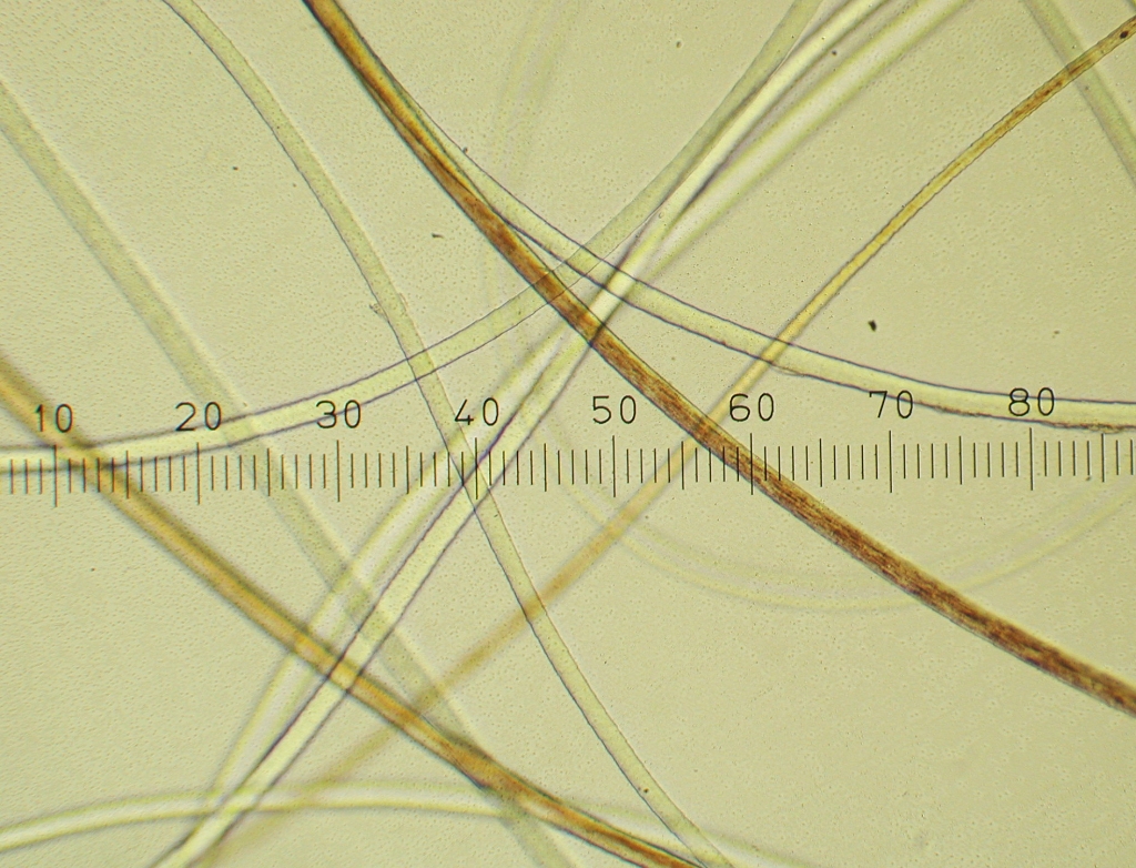 Alpaca fibers of various sizes with micrometer. Alpaca, 100x. Each division of the graduated scale is approximately 10 microns at the 100x magnification. Notice the variability in size of the fibers. These fibers were all taken from one lock of an alpaca fleece.
