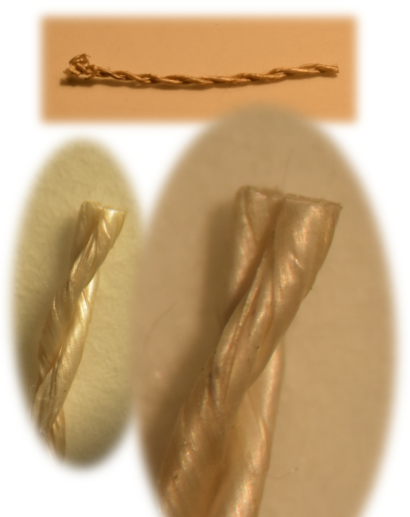This composite image shows a single twisted or spun segment of yarn. You can see the two small single strands of yarn have been twisted around each other (i.e. two-ply) to make a relatively uniform and strong material. Original magnifications 1x, 10x, and 20x with incident incandescent light.