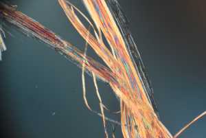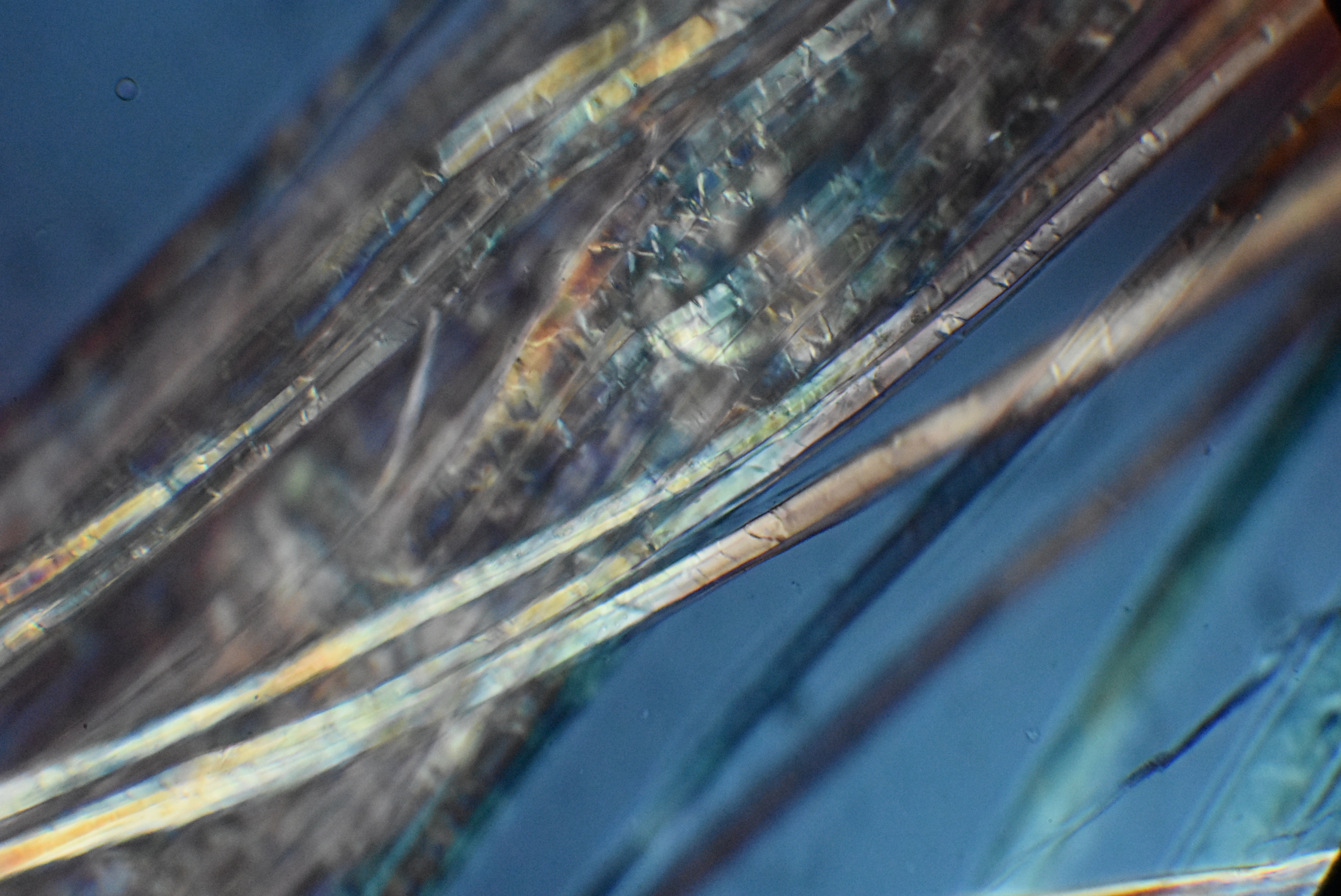 Notice the individual fiber on the right...it has a flattened appearance as it courses up and to the right; again suggesting a relatively flat fiber. Also notice the short cross hatches in the blue colored fibers on the left. Those may represent some surface kinking or other irregularities. The sharply circumscribed black object on the left is an air bubble.