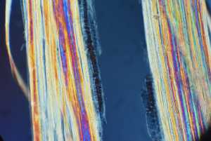 This composite image shows fibers using both conventional light microscopy (upper panel) and cross polarizing lenses (lower panel).